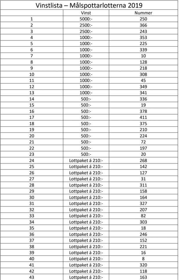 Vinstlista - Målspottarlotterna 2019